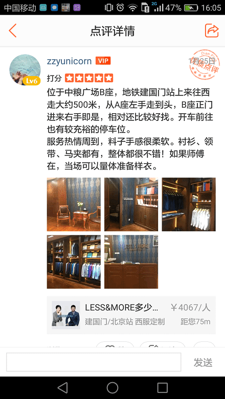 位于中糧廣場B座,地鐵建國門站上來往西走大約500米,從A座左手走到頭,B座正門進來右手即是,相對還比較好找。開車前往也有較充裕的停車位。服務(wù)熱情周到,料子手感很柔軟。襯衫、領(lǐng)帶、馬夾都有,整體西服定制店都很不錯!如果師傅在,當場可以量體準備樣衣。